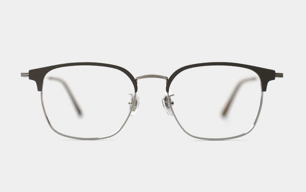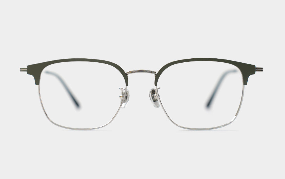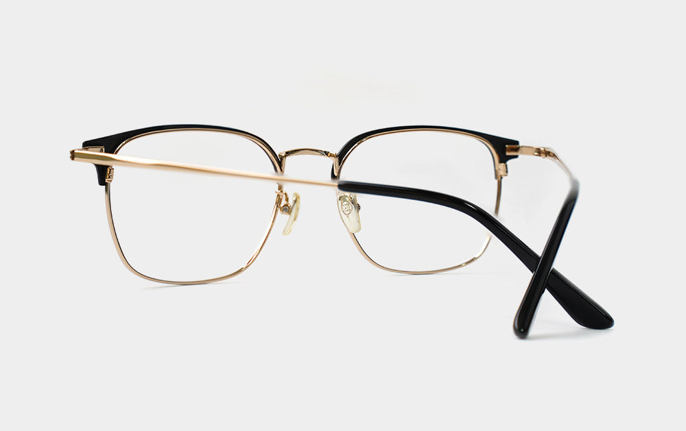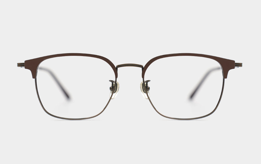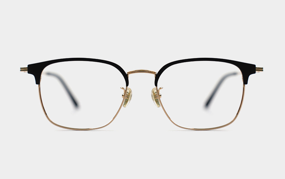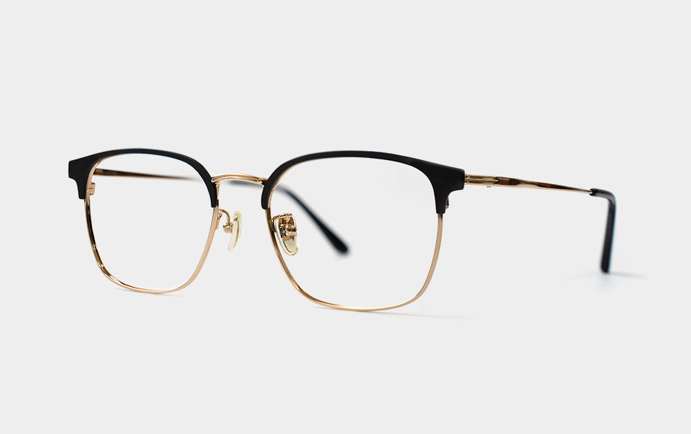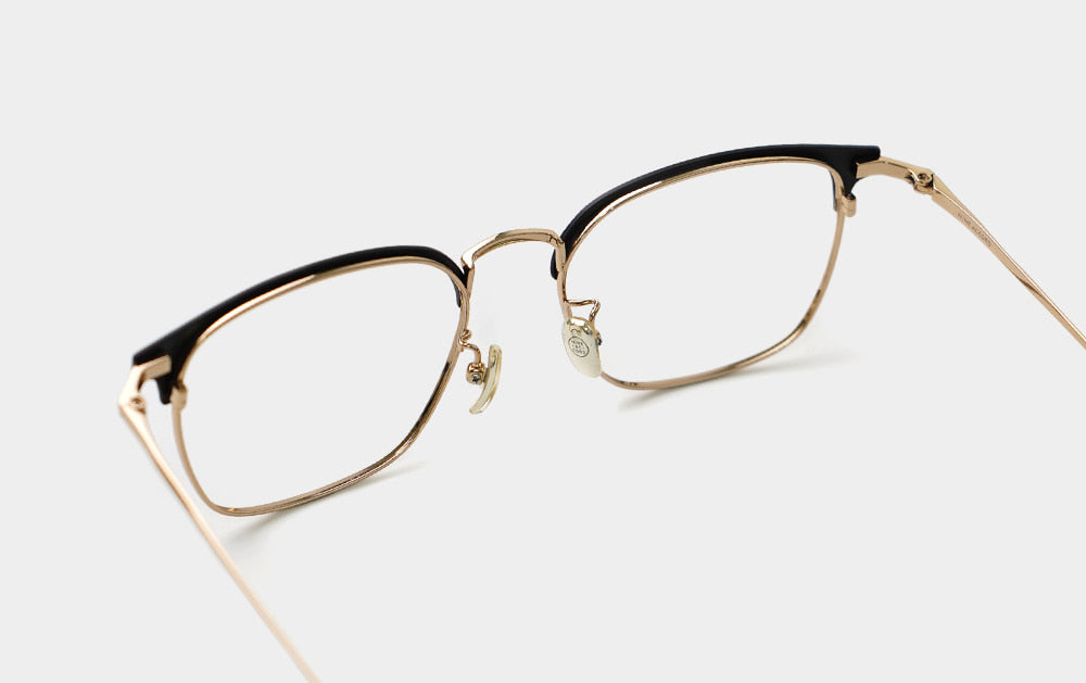 It is a metal frame with a gold-rimmed style. The upper part of the rim can be painted in various matte colors to create a variety of looks. It is very light because it uses titanium material all over. It is a big-sized frame with a long end piece. It is not visible to the naked eye, but it is a daily eyeglass with a detailed design that gives a little volume to the outer part of the temple.