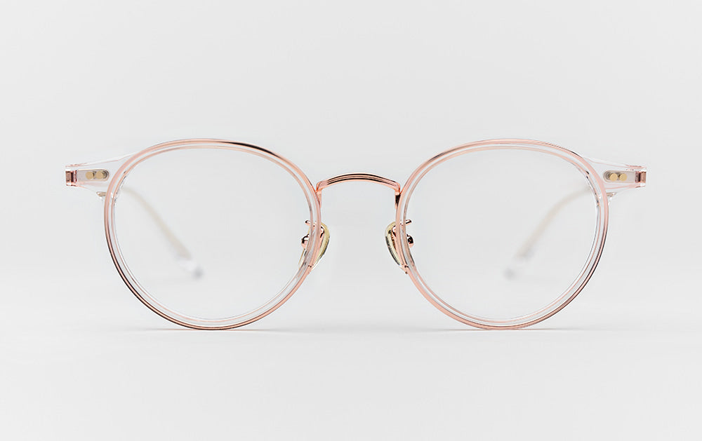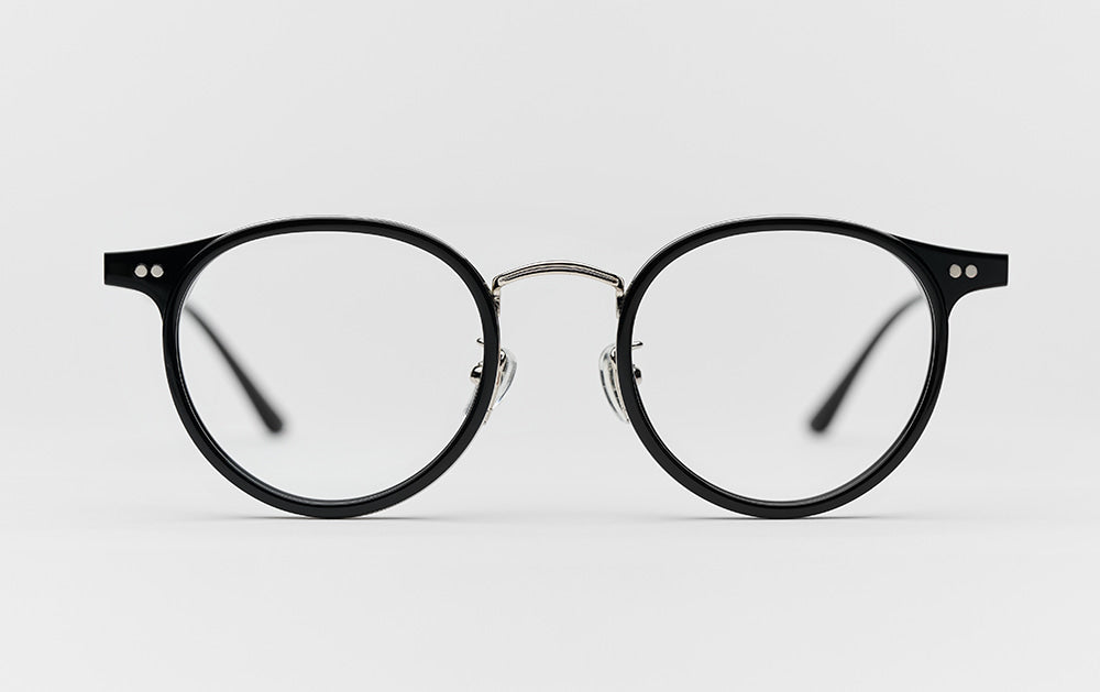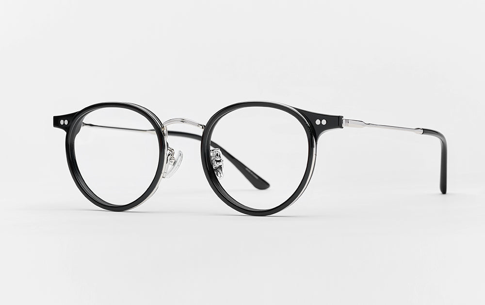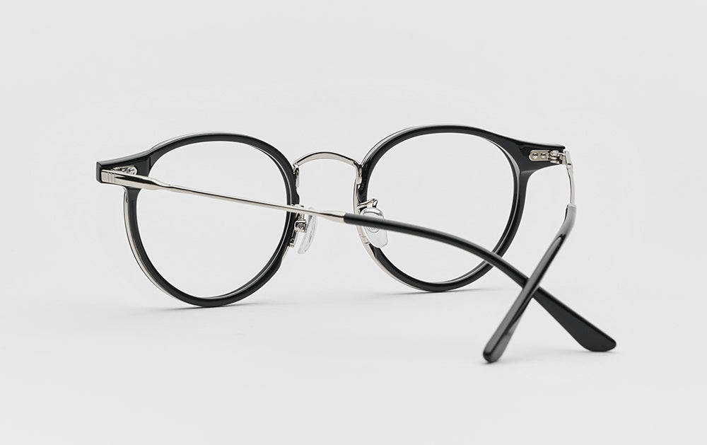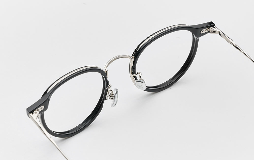 These round-lens combination glasses feature an acetate rim wrapped around a titanium metal rim, creating a design that captures the appeal of both metal and horn. The tall, elongated endpiece is striking, with a three-dimensional dot-shaped metal feldspar atop it. The temples are designed to be both thin and thick, creating a captivating effect.