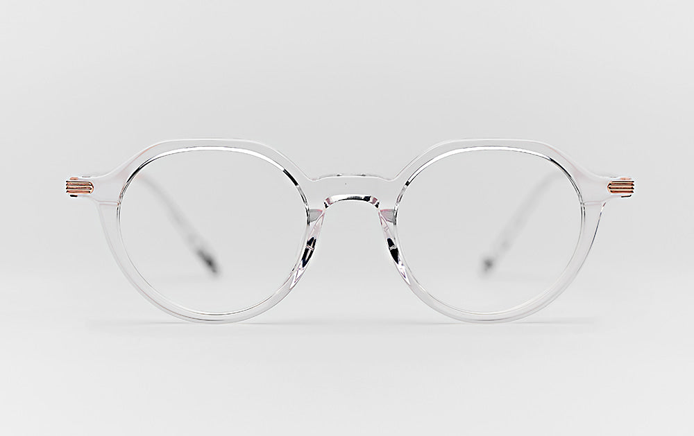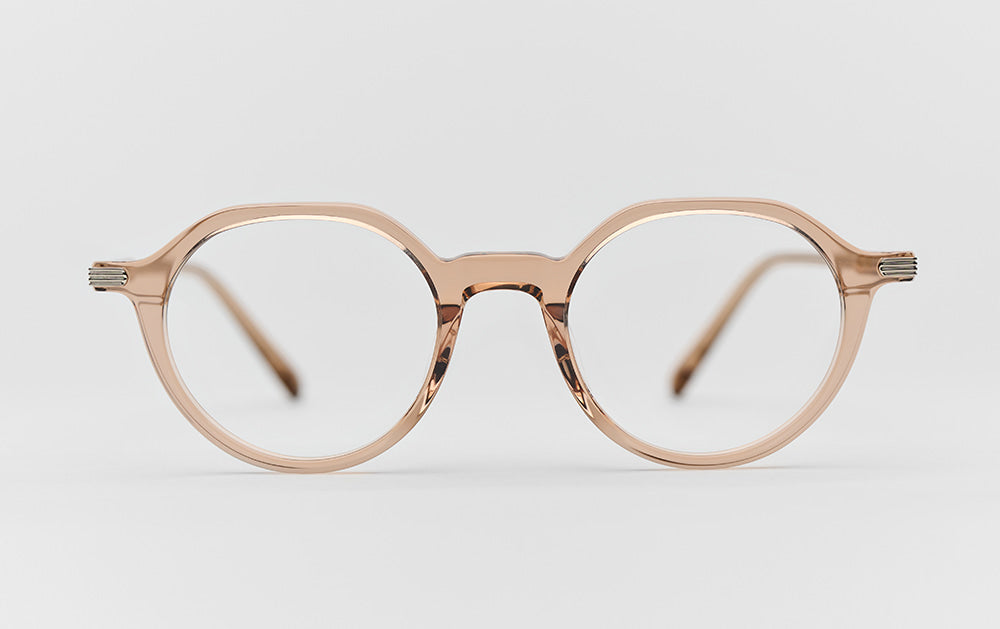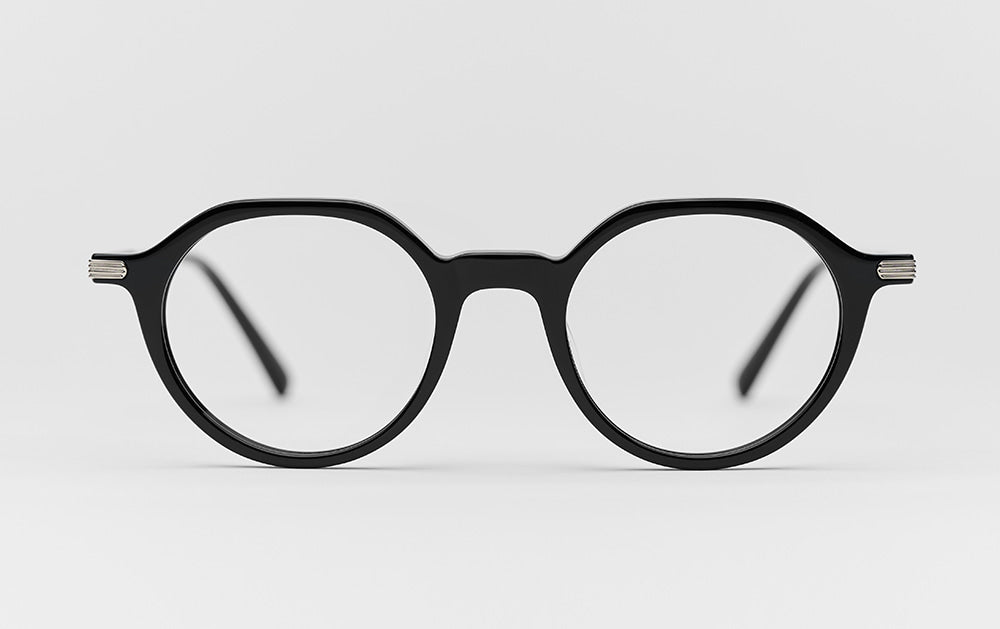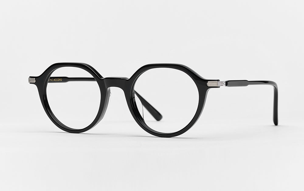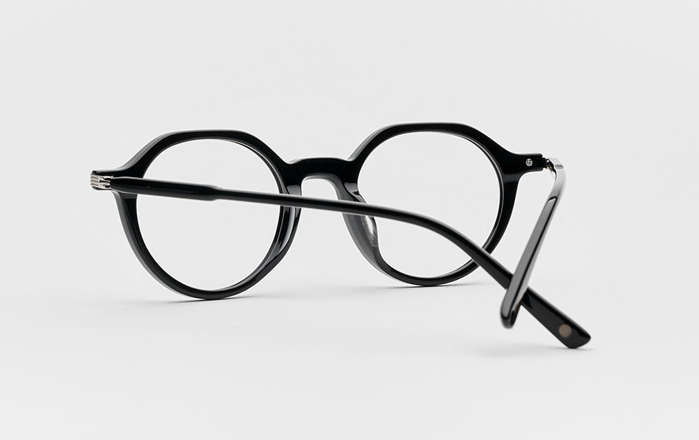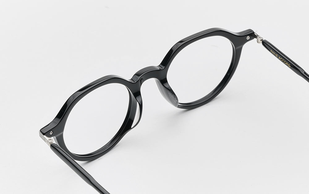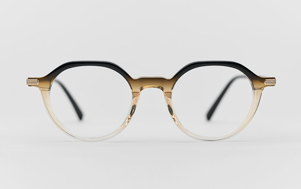 These combination glasses feature a rounded, hexagonal lens shape. The front is horn-rimmed, and the endpiece and temples are made of titanium metal. Acetate long tips on the temples create an overall horn-rimmed design. The black gradient color, in particular, offers a variety of hues, from black to brown and clear, creating a unique accent.